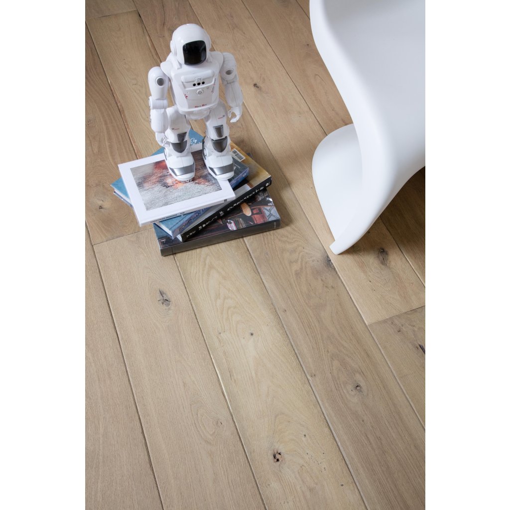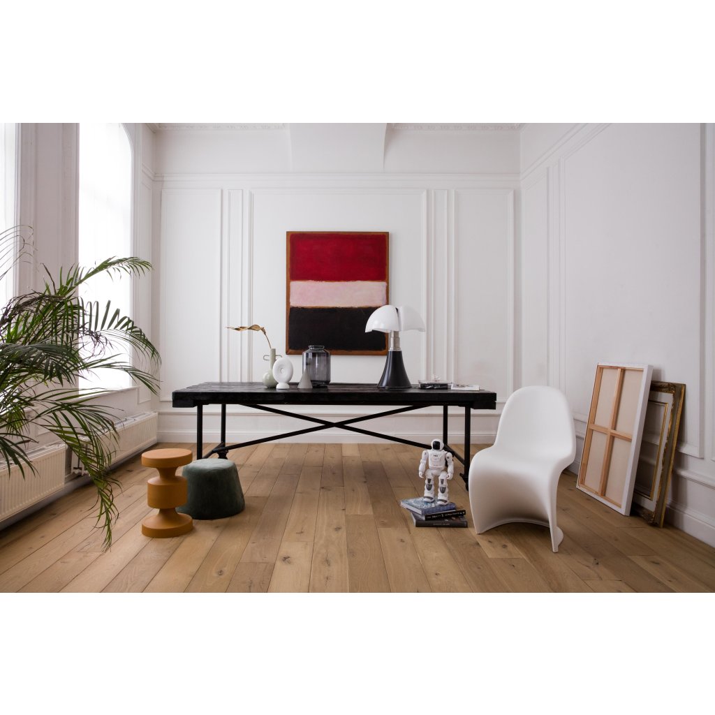 Vďaka použitým jedinečným mechanickým a ručným postupom dosahuje táto podlaha výnimočný vzhľad a pocit. Kované zrezané hrany vytvárajú nepravidelné okraje, intenzívne kefovanie reprodukuje efekt starnutia a sotva viditeľné stopy po píle alebo odreniny. Vyberte si medzi povrchovou úpravou Aged, Rustic, Chevron alebo Herringbone: nechajte parkety stať sa stredobodom vašich najinšpiratívnejších nábytkových kúskov a splňte si svoje najdivokejšie sny o interiérovom dizajne.